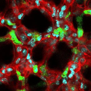 Previous Image Next Image GG448_60x1xRAt_urethaneNebulize_neep7_postztlapse_0003-1_cropped Neutrophils (green) and other leukocytes (cyan) are migrating into inflamed alveoli (red).